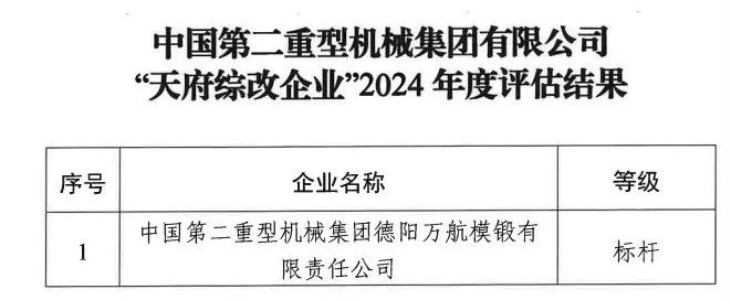 近日,四川省政府國有資產(chǎn)監(jiān)督管理委員會公布了“天府綜改企業(yè)”2024年度評估結(jié)果,萬航模鍛在全省100戶“天府綜改企業(yè)”中脫穎而出,再次獲評“標桿”企業(yè)。